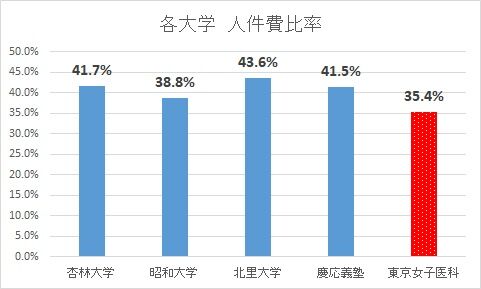 医学部を持つ各大学の人件費比率を並べると下記のようになり、女子医科大学が著しく低いことがわかる。