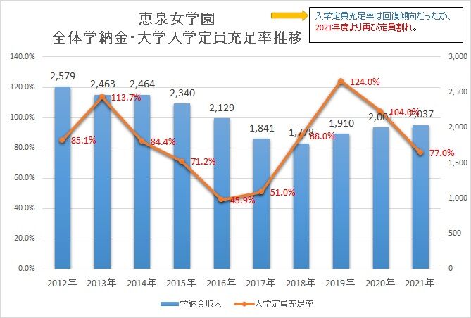 その後、徐々に持ち直したが2021年度より再び定員割れ。全盛期は25億円もの学納金収入があったが、今や20億円程と2割も減少。今後回復する見込みも、まあないだろう。