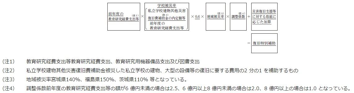 余談だが、その後会計検査院の指摘により、過大交付があったとして、4法人が補助金の一部返還した。通常、特別補助に係る計算は事業団が定めているが、今回の震災に係る計算式は急を要するため文科省がはじき出した。