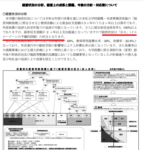 今回も見ていく指標は①「運用資産余裕比率」②「経常収支差額比率(3か年)」③「固定負債構成比率」④「学部収容定員充足率(3か年)」の4つだ。