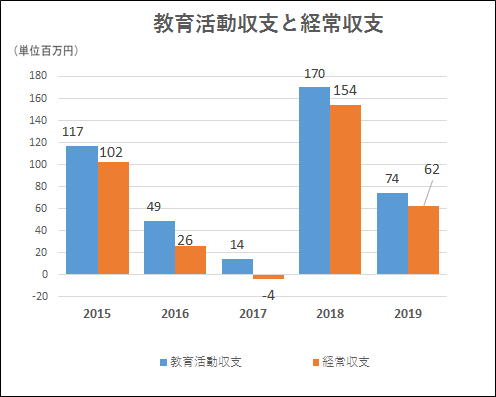 問題は全国平均を軽く超えてきた大阪体育大学。まず債務超過状態にあるのでいち早く借入金を返済して身軽になる必要がある。借入金利息15百万支払っているが、そんなもの払っている場合ではない。 借入金の中身を見ると青凌高校・中学校校地取得、校舎増築、校舎建設費用など。教育に対する投資は必要だが、実力に見合った額でやるべきだ。 こういった設備投資があるから経常収支差額が赤字なのでは?という問いの答えはノーだ。この大学、設備関係収支を除いた教育活動収支(本業)も本年度のみ辛うじて黒字、それ以前の4年間は赤字だ。