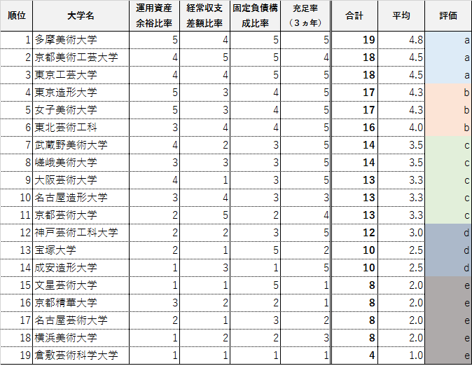 音楽単科大学で頑張っている全国12大学。その財務健全性を測るため、4つの指標で5段階評価・点数化を行いランク付けをした。